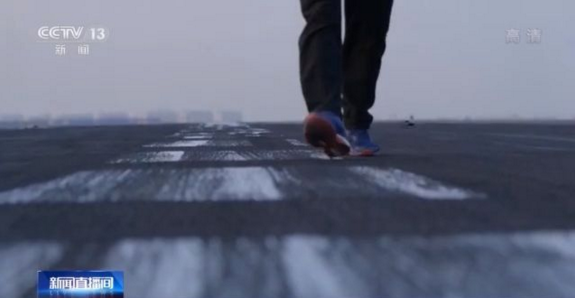 總臺央視記者 李寧:我現在是在海軍艦載航空兵某部,現在已經有戰斗機進入飛行甲板,這個甲板是按照航母1:1來建造的。