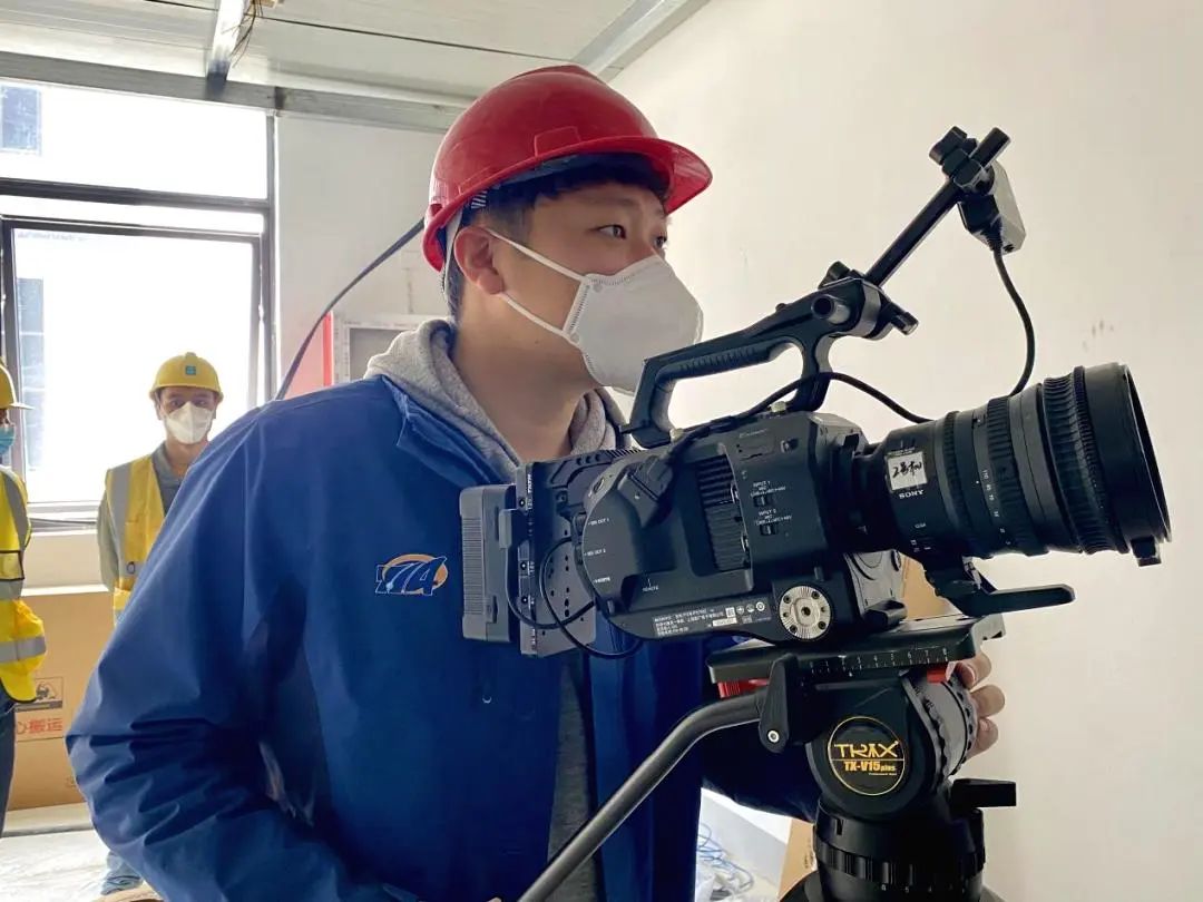 聲像保障第一時間到位。七一四所青年突擊隊員潘偉、張浩偉抵達當晚便投入到拍攝工作中。面對上百個工作面、數(shù)千位建筑工人,潘偉、張浩偉發(fā)揚敢打敢拼的戰(zhàn)斗精神,在現(xiàn)場架設(shè)了8個機位、2架無人機同時進行拍攝。有時為了找到一個合適拍攝角度,兩人克服恐懼在高達八米的屋頂架設(shè)拍攝機位,為工程建設(shè)拍攝下了近百份寶貴的聲像資料。