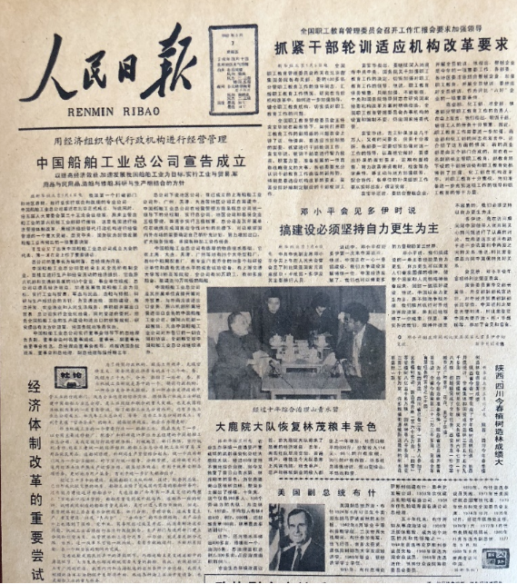 “改革開放是決定當(dāng)代中國命運的關(guān)鍵一招。”1982年5月7日《人民日報》頭版刊載文章:“用經(jīng)濟組織替代行政機構(gòu)進行經(jīng)營管理——中國船舶工業(yè)總公司宣布成立”,標(biāo)題下文又著重強調(diào)“以提高經(jīng)濟效益,加速我國船舶工業(yè)為目標(biāo),實行工業(yè)與貿(mào)易,軍用品與民用品,造船與修船,科研與生產(chǎn)相結(jié)合的方針”。頭版還發(fā)表了以“經(jīng)濟體制改革的重要嘗試”為標(biāo)題的“社論”。在這期《人民日報》的頭版還刊發(fā)了鄧小平同志接待外賓時的講話“搞建設(shè),必須堅持自力更生為主”。