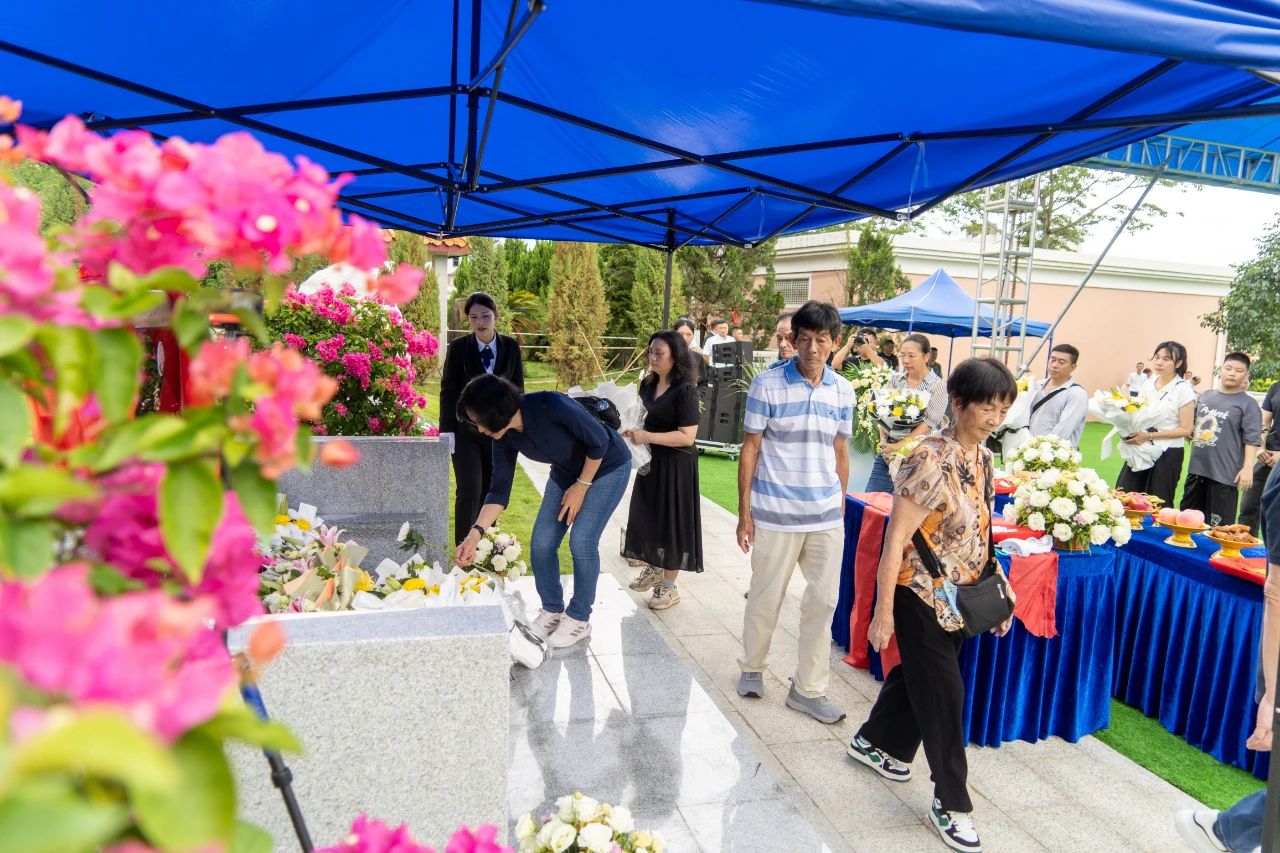 10時,骨灰安放儀式正式開始。親屬代表擦拭墓碑后,在禮賓人員的引導下將黃旭華院士的骨灰安放進墓穴。參加儀式的人員向黃旭華院士墓碑行三鞠躬禮,并敬獻鮮花。眾人以簡約但莊重的儀式,送別這位為我國核潛艇事業默默奉獻一生的國之脊梁。
