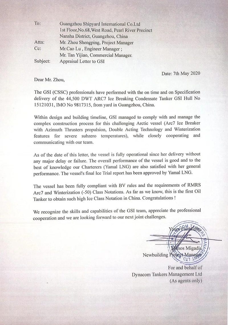 ????5月7日,中國船舶集團(tuán)旗下廣船國際收到了來自希臘Dynacom航運(yùn)公司的感謝信,信中贊揚(yáng)了廣船國際為其建造的極地凝析油船“BORIS SOKOLOV(鮑里斯索科洛夫)”號(hào)