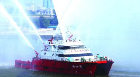 2010年12月28日,廣船國(guó)際為南沙區(qū)建造的“南沙號(hào)”消防船投入使用。“南沙號(hào)”消防船總長(zhǎng)46米,型寬15米,排水量達(dá)到680噸,航速可達(dá)32.4公里/小時(shí),共設(shè)置有6門水炮。其中,2門主炮射程可達(dá)到150米,4門副炮射程可達(dá)到130米;還設(shè)置了全船水幕保護(hù)系統(tǒng),在火災(zāi)現(xiàn)場(chǎng)可有效保護(hù)自身安全。“南沙號(hào)”消防船是當(dāng)時(shí)國(guó)內(nèi)最大雙體專勤消防船,大大增強(qiáng)了對(duì)船舶火災(zāi)、石化碼頭、油庫火災(zāi)的撲救能力。