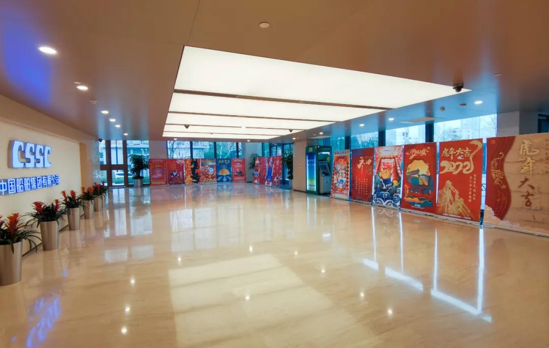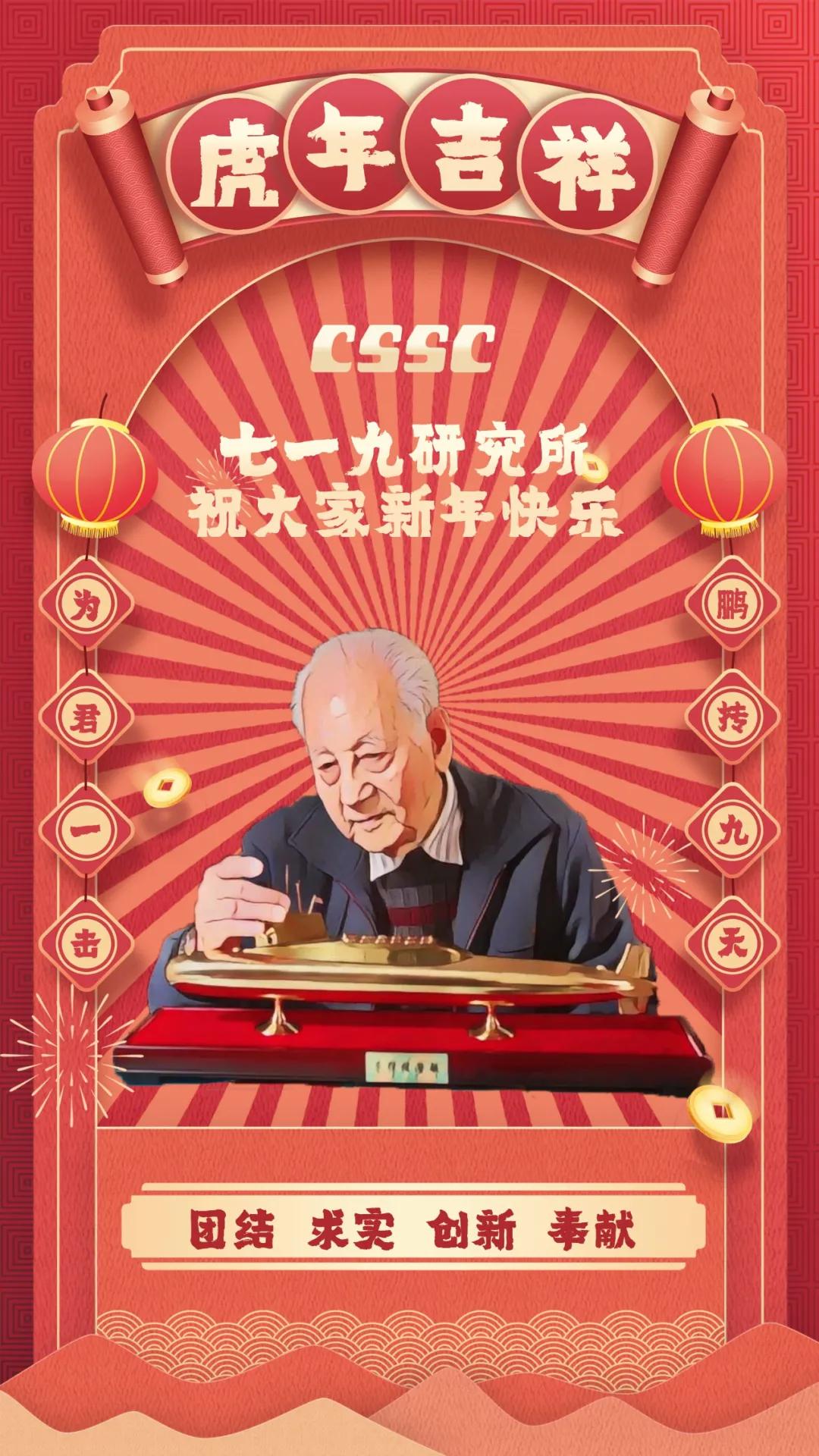 節(jié)日的煙花詮釋喜慶,大紅的燈籠點(diǎn)亮祝福!黃旭華院士作為七一九所典型人物代表,認(rèn)真注視著他為之奉獻(xiàn)一生的艇,也反映了這條戰(zhàn)線上科技工作者們“團(tuán)結(jié)、求實(shí)、創(chuàng)新、奉獻(xiàn)”的工作作風(fēng)。“為君一擊 鵬摶九天”暗藏“一九”二字,反映出七一九所肩負(fù)的責(zé)任之大,使命之重,表達(dá)了軍工人將船舶事業(yè)做大做強(qiáng)的決心。