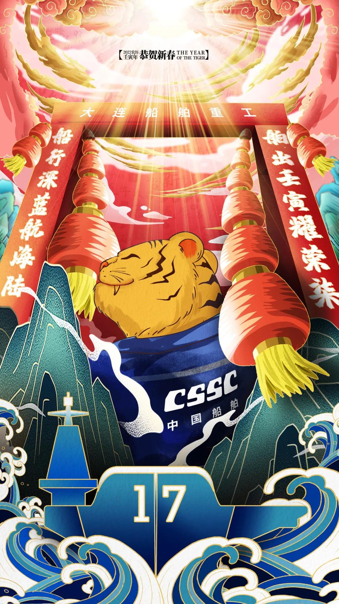 海報(bào)采用國(guó)潮設(shè)計(jì),富有層次感。航海陸對(duì)應(yīng)遼寧艦舷號(hào)16,耀榮柒對(duì)應(yīng)山東艦舷號(hào)17;兩座山則是對(duì)應(yīng)遼寧半島、山東半島;龍門架將兩座山連接,建造了兩艘航母;龍門架后是漫漫長(zhǎng)路;身穿中國(guó)船舶服裝的壬寅虎保持自信的微笑,堅(jiān)定未來(lái)路。