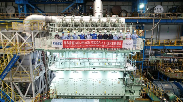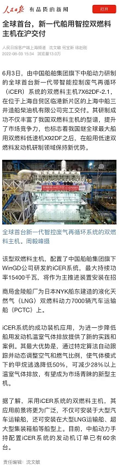該型雙燃料主機,配置了中國船舶集團旗下WinGD公司研發的iCER系統,最大持續功率15400千瓦,將作為主推進裝置安裝在招商局金陵船廠為日本NYK船東建造的液化天然氣(LNG)雙燃料動力7000車汽車運輸船(PCTC)上。