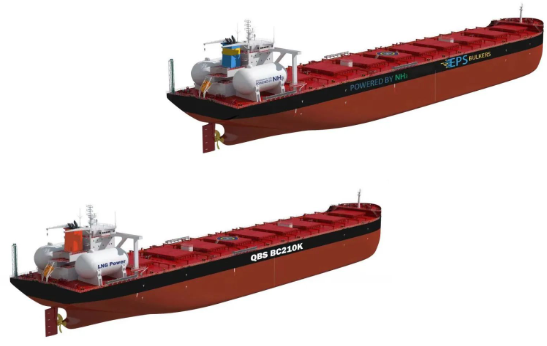 新的一年,北海造船聯合中船貿易,與新加坡東太平洋航運公司(EPS)簽署了4艘21萬噸Ammonia DF/DF Ready散貨船建造合同,與日本商船三井簽署了3艘21萬噸LNG雙燃料動力散貨船建造合同。