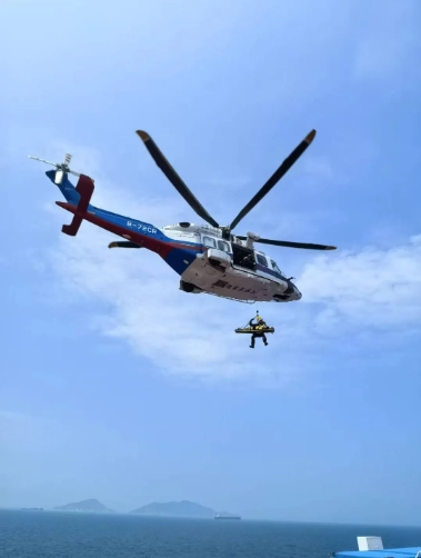 接報后,廣船國際立即啟動航空救援,第一時間聯系海上航空救助和最近的珠海醫院,一場生死競速在南海的碧海藍天間極速展開!在交通運輸部南海第一救助飛行隊、珠海市中山大學附屬第五醫院和試航項目組的通力協作下,半小時后,藍白相間的救援直升機飛臨懸停試航船舶的直升機平臺。