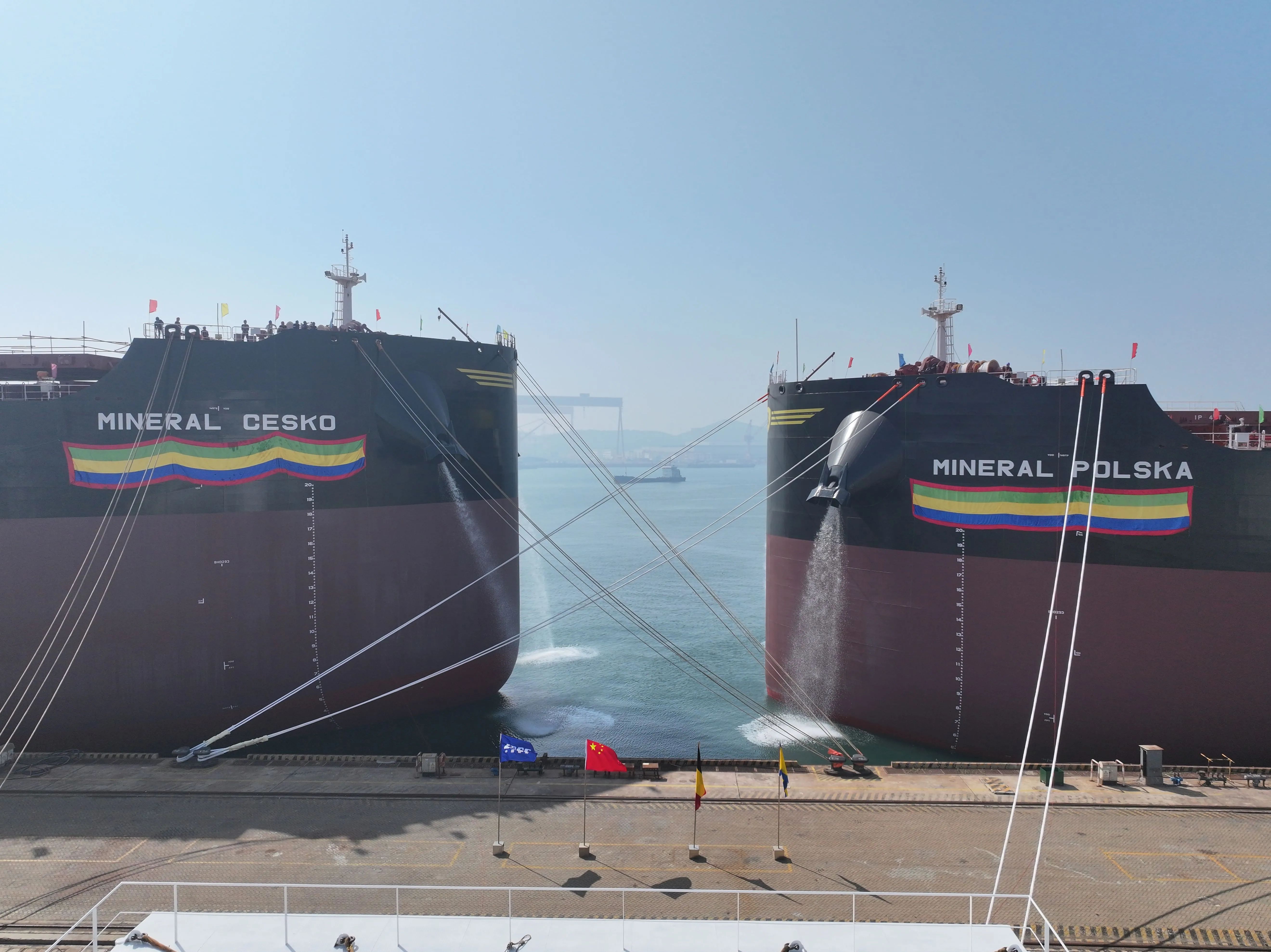 5月20日,北海造船為比利時(shí)CMB.TECH公司建造的2艘21萬(wàn)噸氨燃料預(yù)留散貨船“MINERAL?CESKO”號(hào)和“MINERAL?POLSKA”號(hào)同日命名。